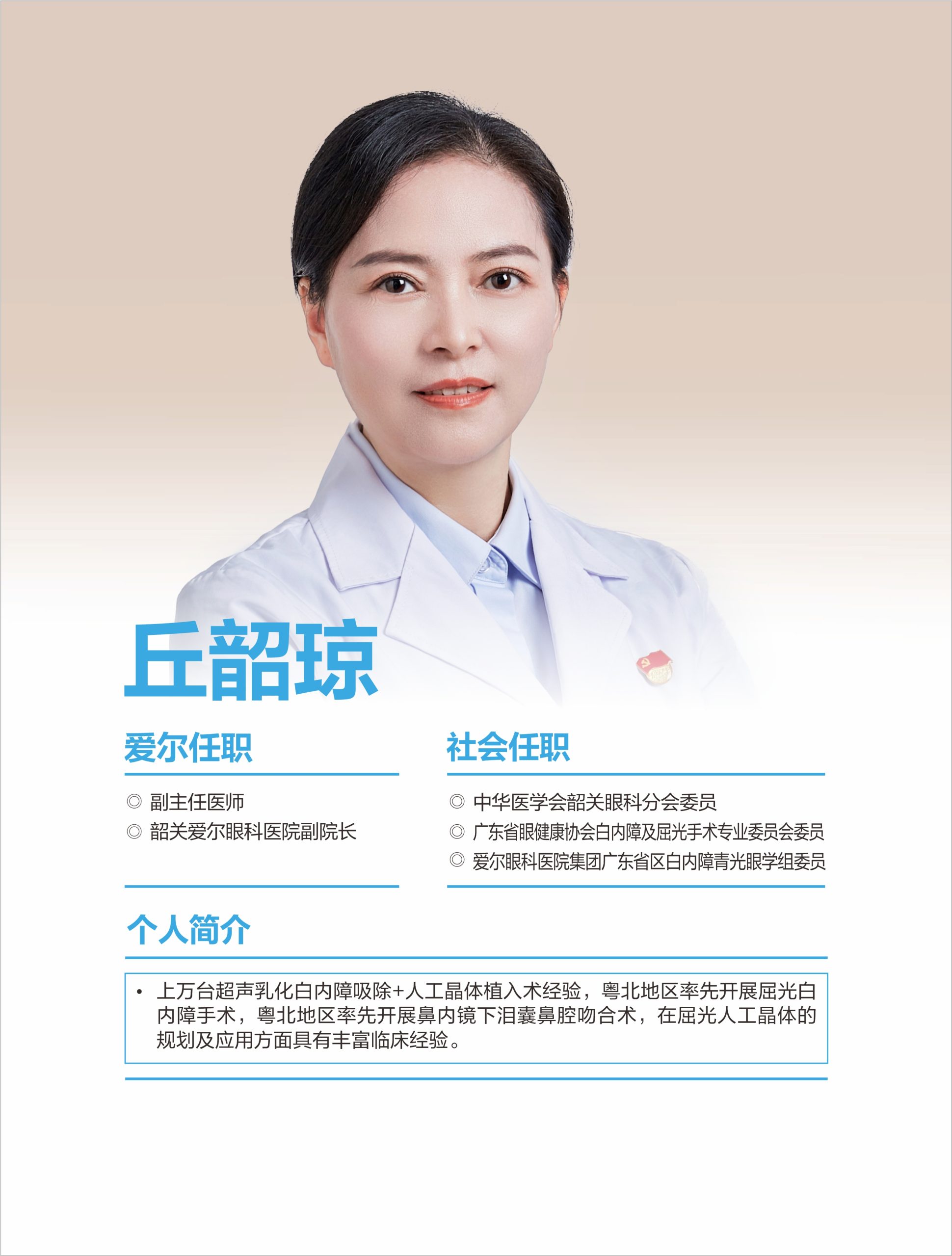 韶關愛爾眼科醫(yī)院有限公司白內障團隊擁王愛琴院長(愛爾眼科粵北區)、丘韶瓊院長、郭俊豪主任等多位專科醫(yī)生,具備同步國際的白內障手術能力,能熟練開展各項常規(guī)及疑難白內障手術。 可開展微切口煥晶白內障手術,植入多焦晶體或多焦+散光矯正晶體,在治療白內障同時同步解決遠視/近視、老花眼、角膜散光等屈光問題,醫(yī)生手術經驗豐富,為眾多患者帶來更舒適的視覺。
